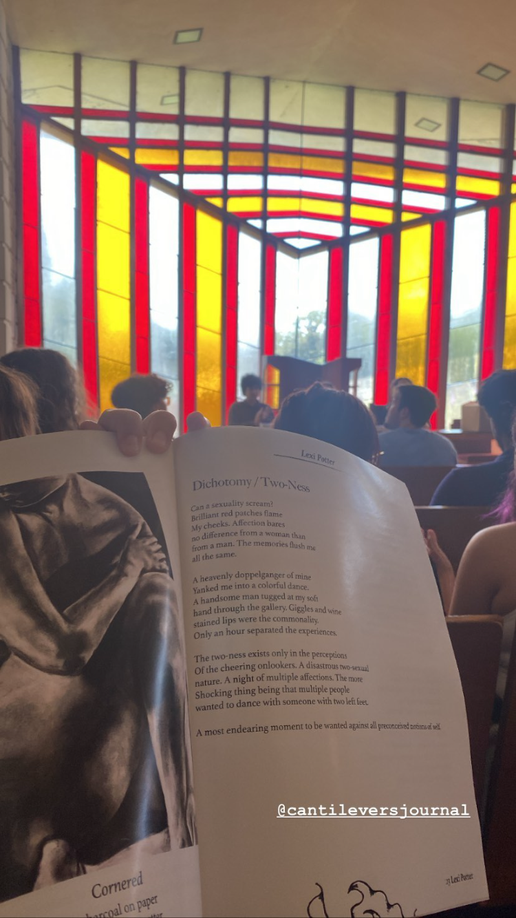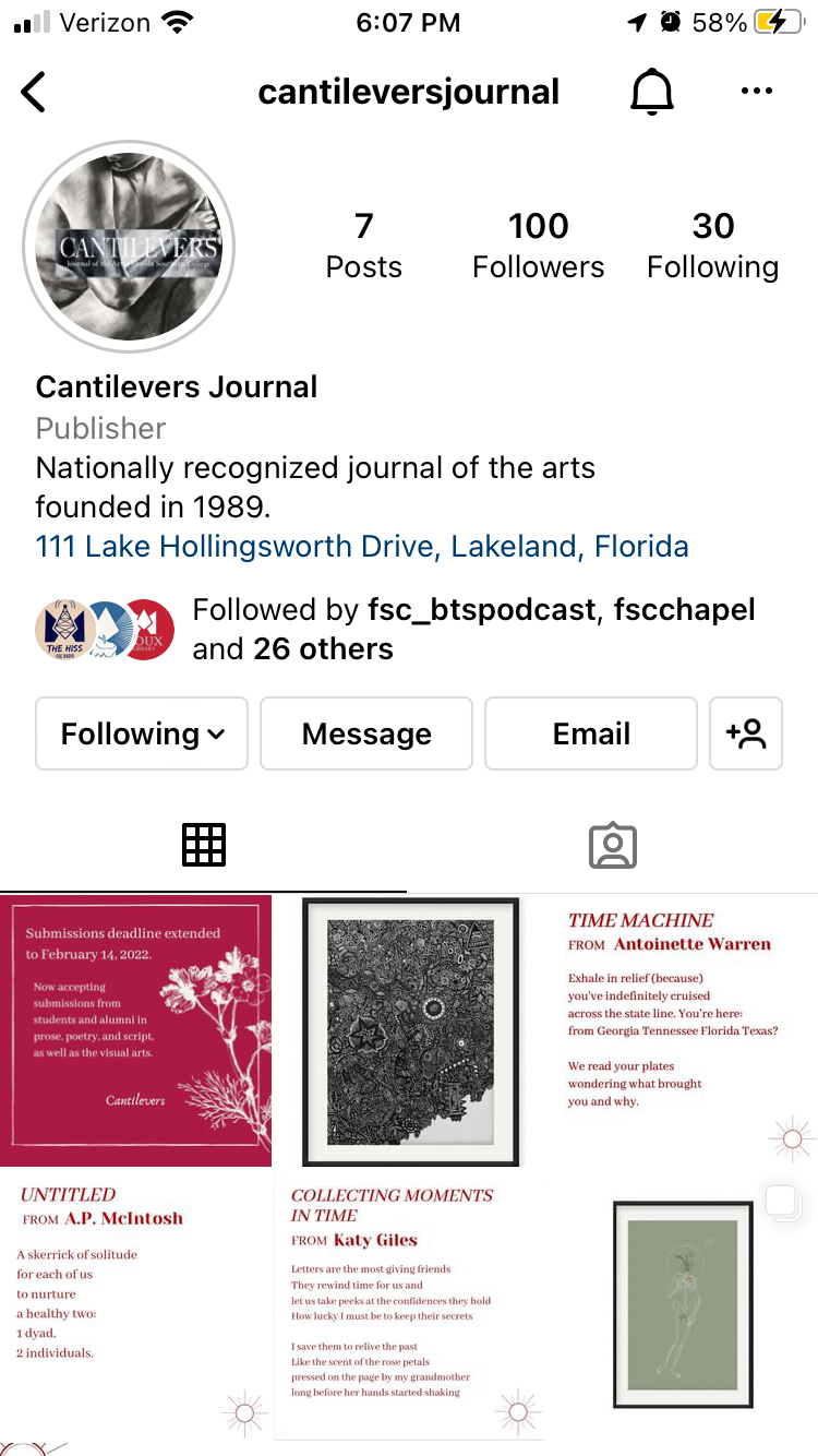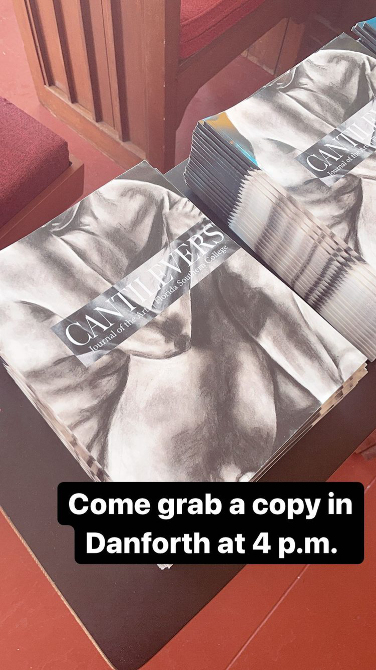 My artwork was shown in the Cantilevers Journal of the Arts, a student publication from Florida Southern College. This magazine is distributed to the entire FSC campus (~3,000 students), as well as to family and faculty. One of my pieces, originally drawn in a Figure Drawing class, was used as the cover of the journal and as the Cantilevers Instagram icon to brand and market the magazine issue.
